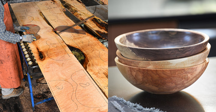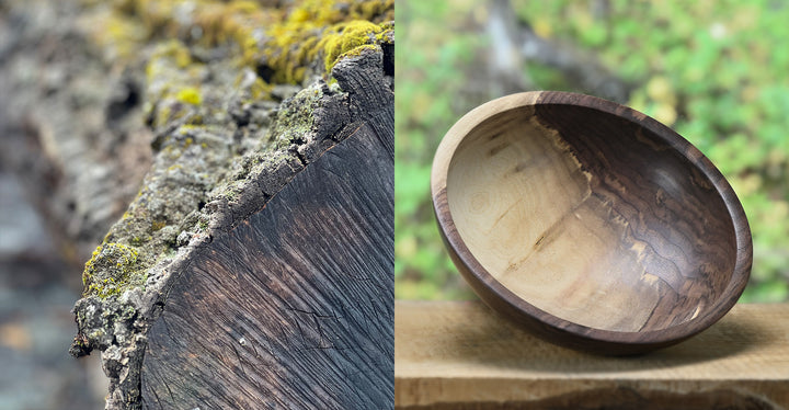When we make a Seventh String Bowl, we start with a log or piece of wood that has a unique story to tell, just like each of our bowls. We re-purpose wood that’s already on our mill site, or salvaged from other sources. We also buy wood from trusted partners; wood that we know will have a great life as a bowl.